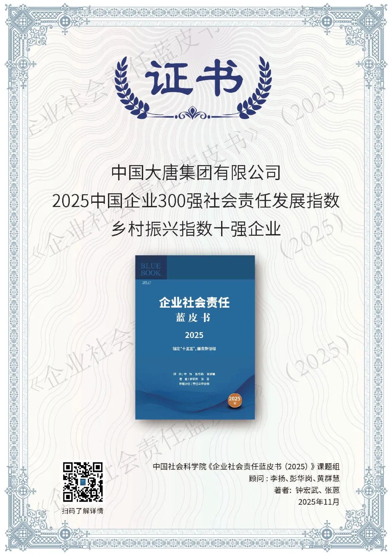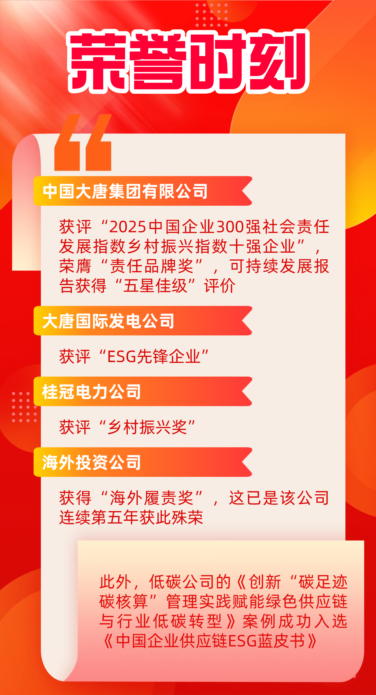 11月20日至21日,“锚定‘十五五’,履责新征程——ESG中国·第八届北京责任展”在北京成功举行。活动期间,正式发布《企业社会责任蓝皮书(2025)》,举办“责任之夜——责任鲸牛奖”颁奖典礼,召开社会责任报告峰会会议。中国大唐斩获六个奖项,一个优秀案例入选《中国企业供应链ESG蓝皮书》。